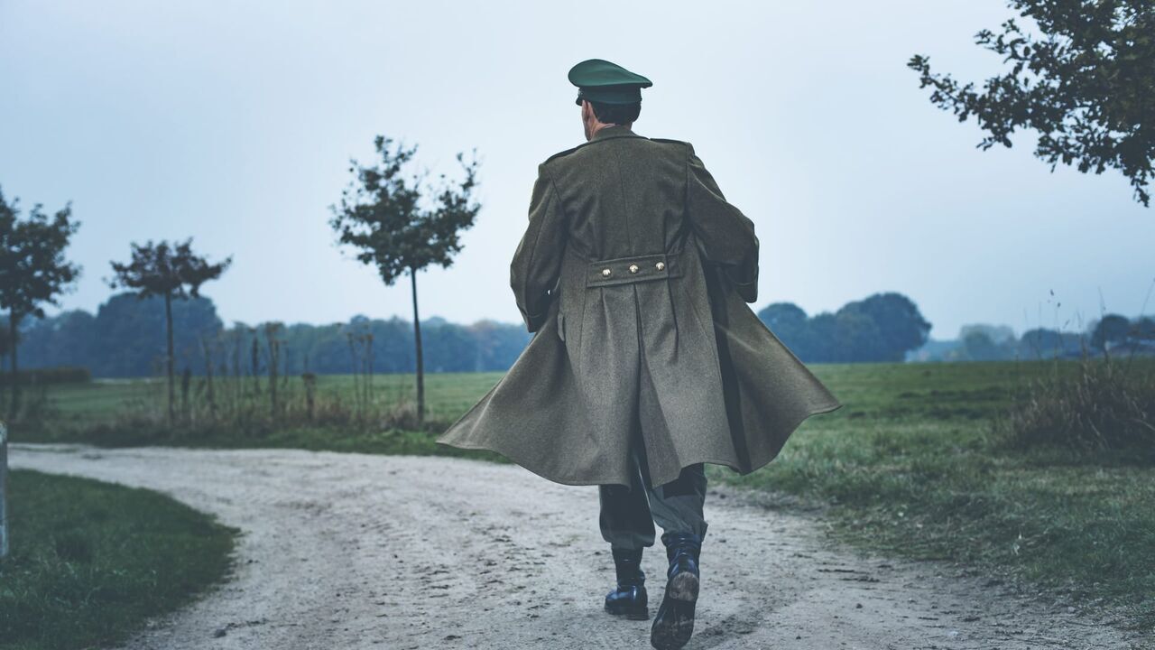 Rear view of vintage 1940s military officer walking on rural road.