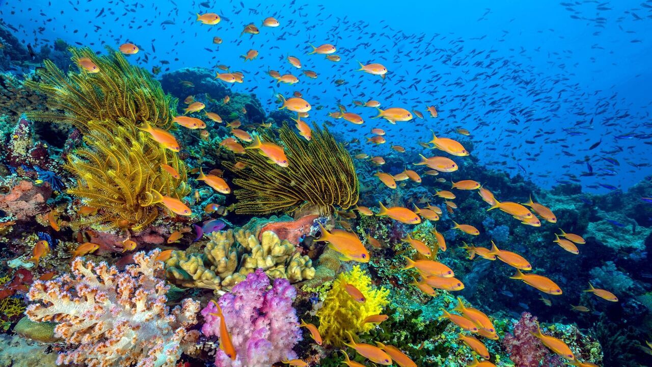 Banc de poissons-barbiers au milieu des coraux,copyright: PLURIMEDIA (BBC / Jason Isley)