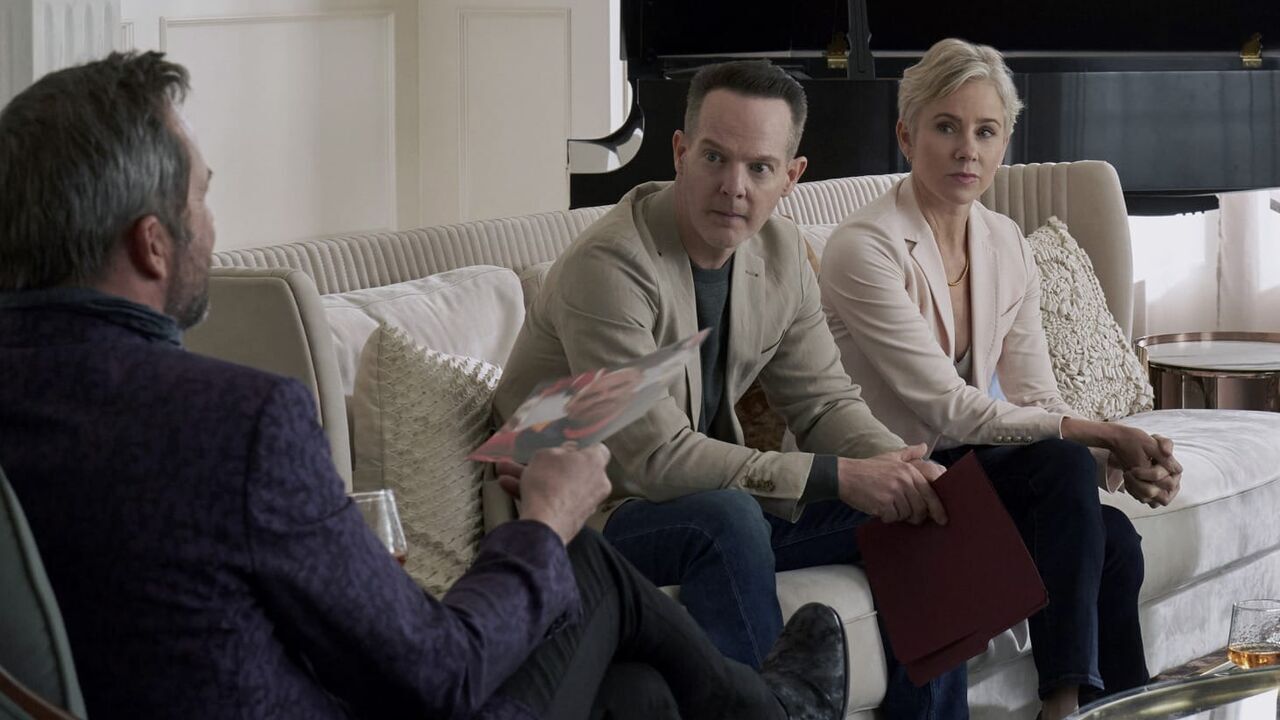 MR. MONK'S LAST CASE: A MONK MOVIE -- Pictured: (l-r) James Purefoy as Rick Eden, Jason Gray-Stanford as Randy Disher, Traylor Howard as Natalie Teeger, Tony Shalhoub as Adrian Monk -- (Photo by: Steve Wilkie/PEACOCK),copyright: PEACOCK / Steve Wilkie/PEACOCK / Episodic / ô © 2023 Peacock TV LLC. All Rights Reserved.