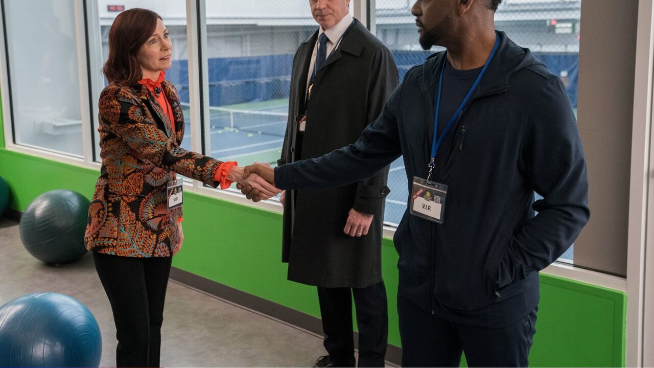 Carrie Preston as Elsbeth Tascioni, Danny Mastrogiorgio as Det. Bobby Smullen and Blair Underwood as Cliff McGrath,copyright: Michael Parmelee / CBS / CBS ENTERTAINMENT / ©2024 CBS Broadcasting Inc. All Rights Reserved.