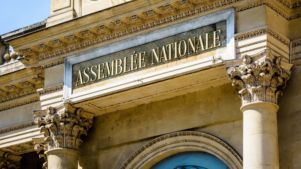 Close-up view of the sign "Assemblee Nationale" in golden letters on the pediment of the southern entrance of the Palais Bourbon, seat of the French National Assembly in Paris, France, on a sunny day.,copyright: Shutterstock / Shutterstock / Copyright (c) 2019 olrat/Shutterstock. No use without permission.