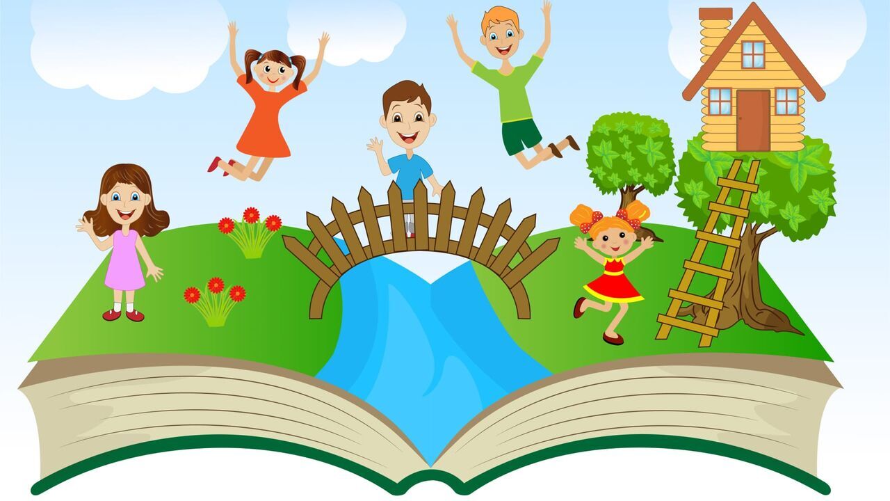 Open book with children and summer landscape.