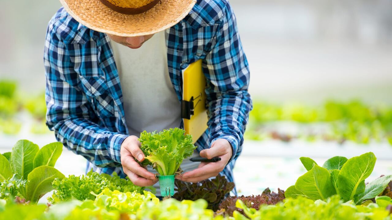 Organic farm with agriculture vegetable hydroponic. organic vegetable is business agriculture growing. Farmer using technology hydroponic cultivation vegetable organic in greenhouse.