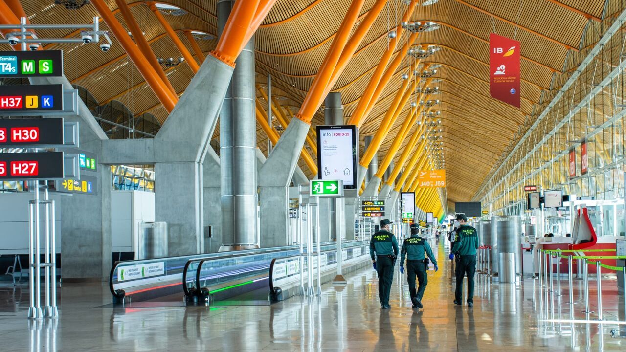 Trois policiers patrouillent dans les halls vides de l'aéroport international de Madrid Barajas.,copyright: Shutterstock / Shutterstock / Copyright (c) 2020 PatSaza/Shutterstock. No use without permission. / Editorial use only