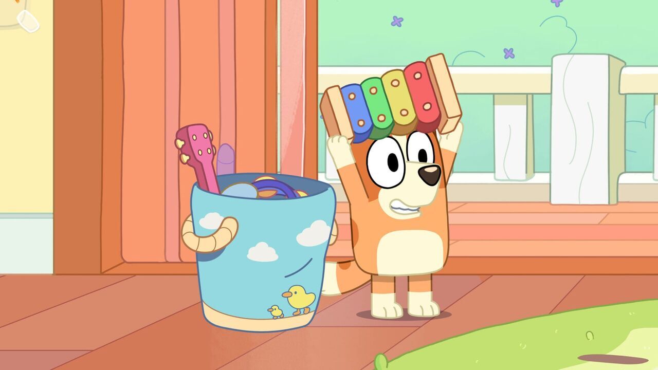 Bluey et Bingo se querellent pour savoir qui utilisera le xylophone magique jusqu'à ce que Papa en prenne le contrôle et fige Bluey.