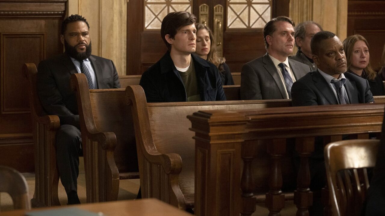 LAW & ORDER -- "Fault Lines" Episode 21004 -- Pictured: (l-r) Anthony Anderson as Det. Kevin Bernard, David T. Patterson as Chad Malloy, Kevin Mambo as Tom McDaniel -- (Photo by: Virginia Sherwood/NBC),copyright: NBC / Virginia Sherwood/NBC / Episodic / 2022 NBCUniversal Media, LLC