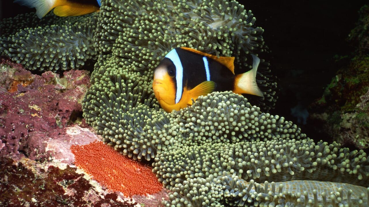 Clowfish looking after the eggs before they hatch Orange-fin clownfish aerating eggs,copyright: Comstock / © Getty Images / Stockbyte