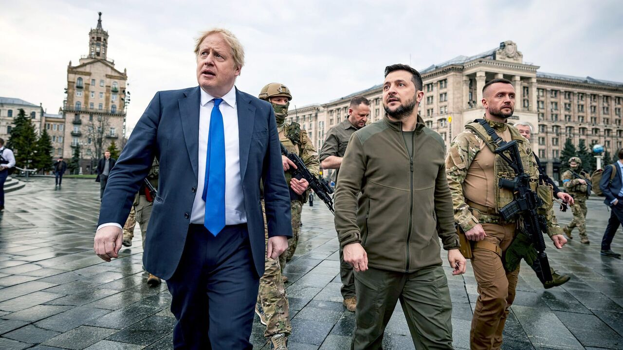 Ukrainian President Volodymyr Zelensky (centre), former British Prime Minister Boris Johnson (left) and security forces on the Maidan in central Kyiv on April 9, 2022,copyright: © American Photo Archive/Alamy Stock Photo