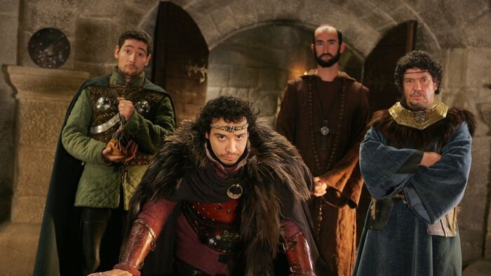 Nicolas GABION, Alexandre ASTIER, Jean Robert LOMBARD, Lionnel ASTIER, decor avec personnages; KAAMELOTT - SAISON 1 Photographe: Jacques MORELL/M6 Ville: ,copyright: Jacques MORELL/M6/Jacques MORELL/M6
