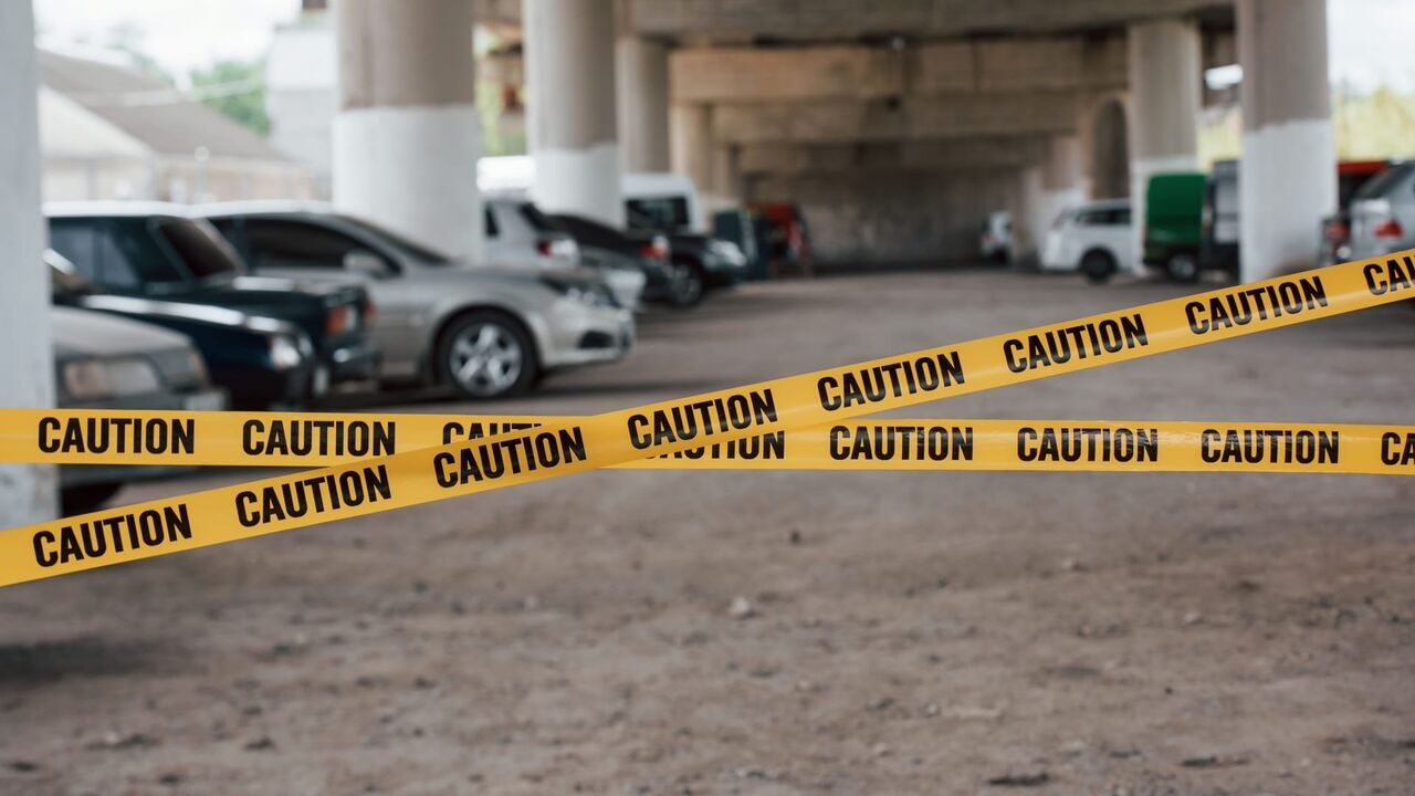 No one will enter until police take care of this. Yellow caution tape near the car parking lot at daytime. Crime scene.