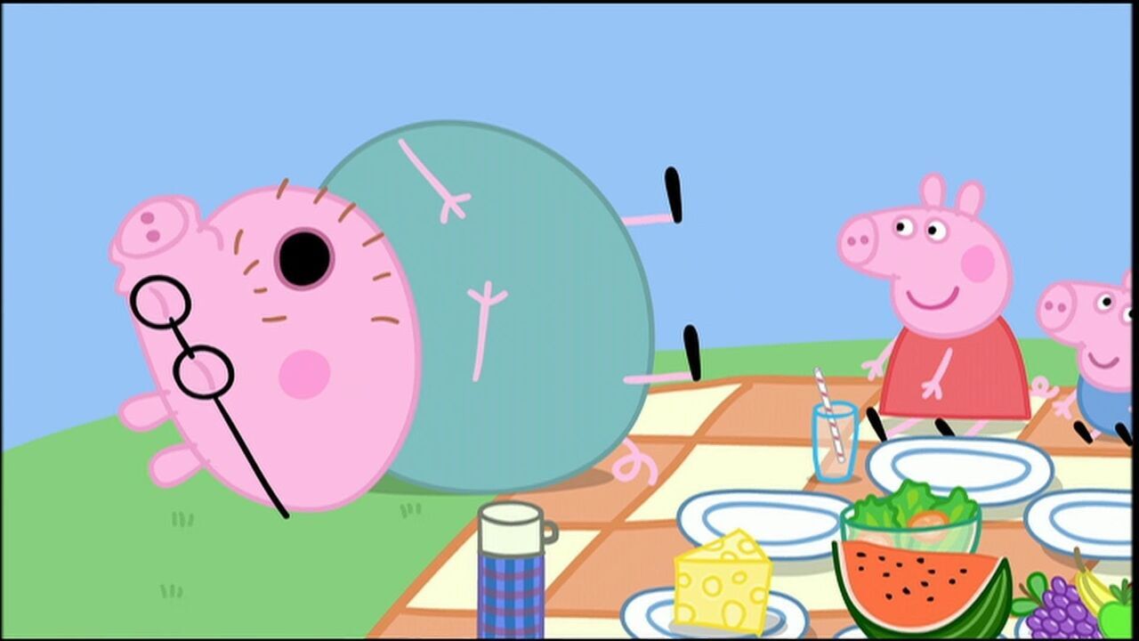 Toute la famille part faire un pique-nique. Pendant que papa fait la sieste, Peppa et George donnent à manger aux canards. Comme il n'y a pas assez de pain pour les nourrir tous, Peppa découpe en petits morceaux la part de gâteau de papa Cochon...