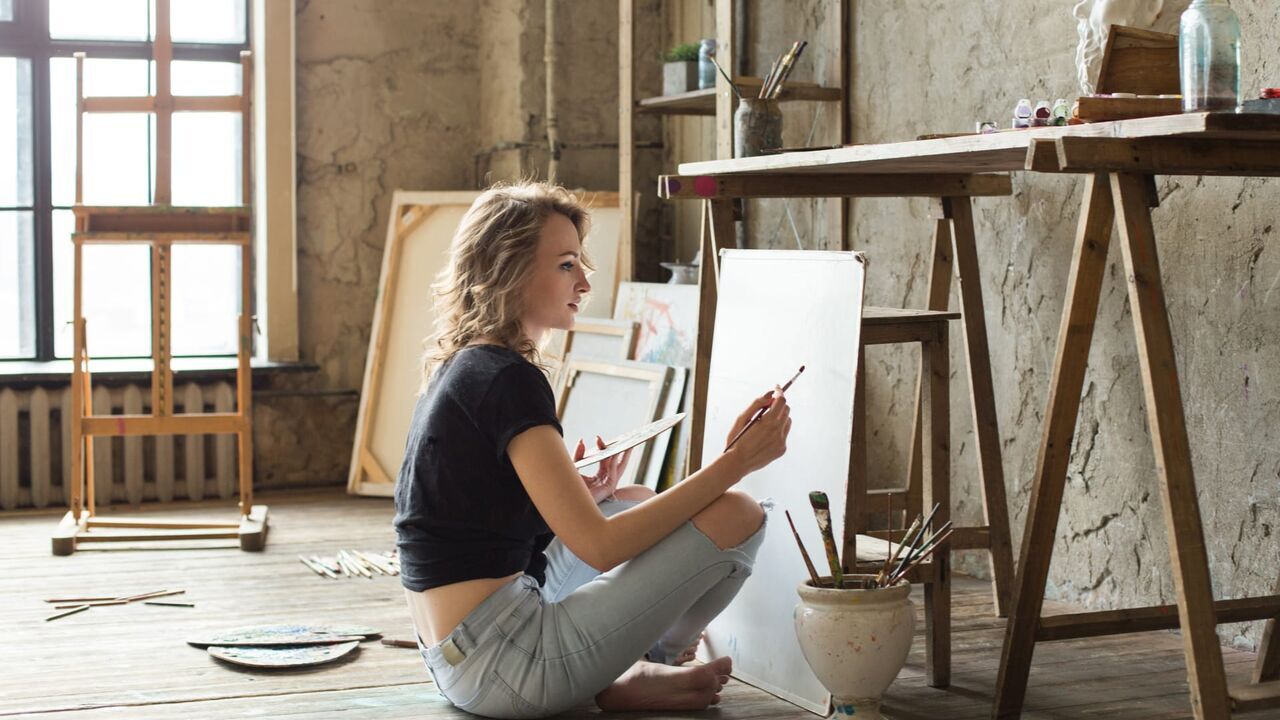 Art school, creativity and people concept - student girl or young woman artist with easel, palette and paint brush painting still life picture at studio.