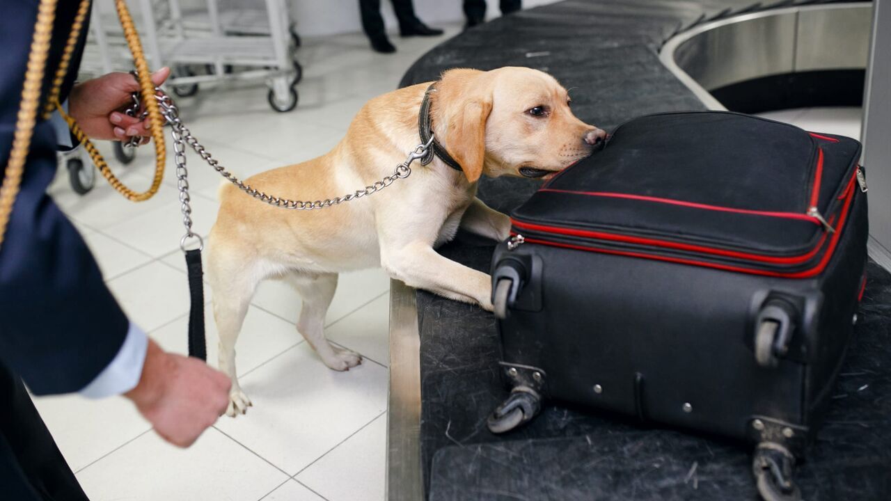 Chien de détection de drogue à l'aéroport recherchant de la drogue dans les bagages.,copyright: Shutterstock / Shutterstock / Copyright (c) 2017 Dragosh Co/Shutterstock. No use without permission.