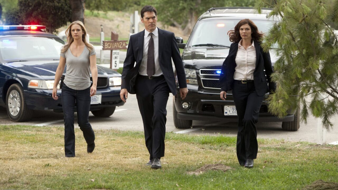 CRIMINAL MINDS - "The Silencer" - In the eighth season premiere, the BAU acquaints itself with a new team member, and reacquaints itself with an old unsub. After a Texas inmate known as the "Silencer" escapes custody during a prisoner transfer, theĘteam tracks his activity by his new victims all found with their mouths sewn shut. Also, Alex Blake joins the team, adding her linguistics skills to the unit's skill set, on "Criminal Minds" airing on CBS on WEDNESDAY, SEPTEMBER 26 (9:00-10:00 p.m., ET). (ABC STUDIOS/MONTY BRINTON)A.J. COOK, THOMAS GIBSON, JEANNE TRIPPLEHORN CRIMINALMINDS_VIII_01_02,copyright: Monty Brinton / ABC STUDIOS / ABC STUDIOS