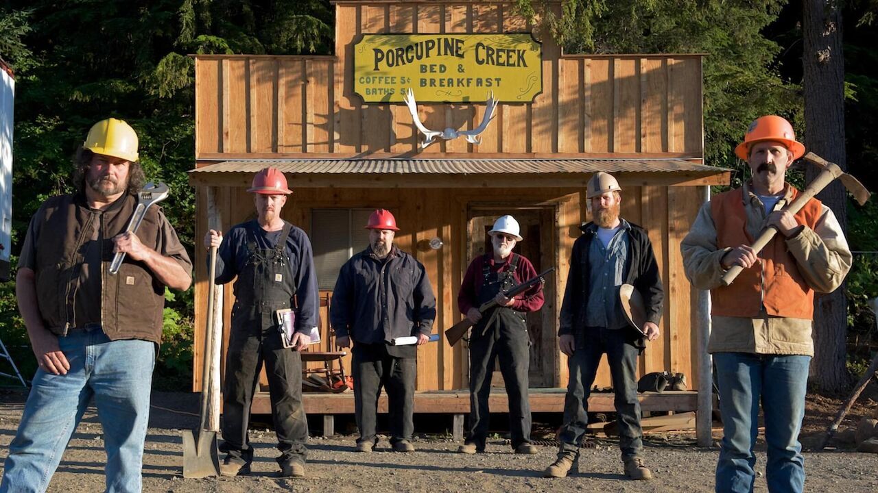 The Gold Rush cast stand in front of their cabin, from left to right: Harness, Greg, Todd, Jack, Dorsey and Thurber.,copyright: Discovery Channel