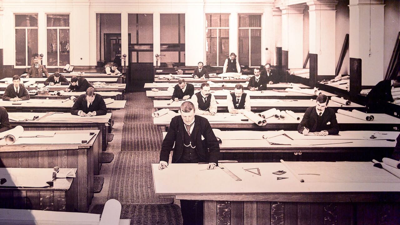 Titanic / Picture of constructors drawing plan in the Titanic Belfast, visitor attraction dedicated to the RMS Tinanic, a ship whic sank by hitting an iceberg in 1912.,copyright: Shutterstock / Shutterstock / Copyright (c) 2016 Anton_Ivanov/Shutterstock. No use without permission.