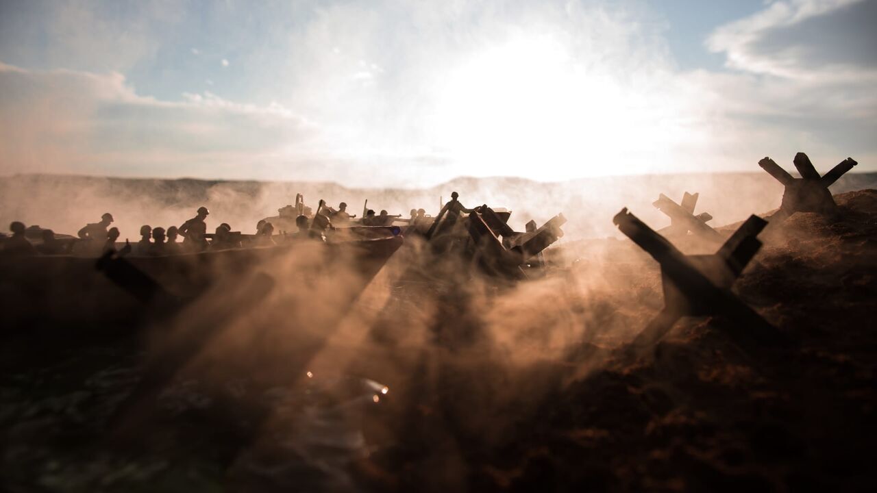 World War 2 reenactment (D-day). Creative decoration with toy soldiers, landing crafts and hedgehogs. Battle scene of Normandy landing on June 6, 1944. Selective focus,copyright: Shutterstock / Shutterstock / Copyright (c) 2022 zef art/Shutterstock. No use without permission.