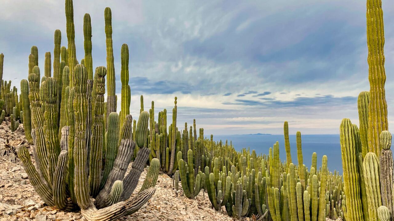 Forêt de cactus cardon géants (Pachycereus pringlei), San Pedro Matir, Mexique. Pour survivre sur cette île déserte isolée, les cactus cardons dépendent d'oiseaux piscivores appelés Boobys. Ils déposent de fortes concentrations de guano qui seraient mortelles pour la plupart des plantes, mais le cardon a évolué pour résister aux toxines et extraire les nutriments provenant des poissons qu'il utilise pour se développer.,copyright: Lance Featherstone / BBC Studios / © BBC STUDIOS