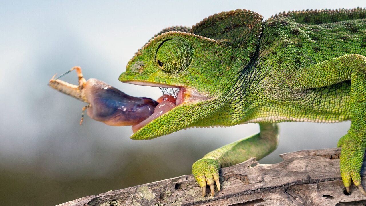 En une fraction de seconde, la longue langue du caméléon européen se déroule d'environ un demi-mètre,copyright: © NDR Naturfilm/Ugo Mellone / Im Bruchteil einer Sekunde schießt die rund einen halben Meter lange Zunge des Europäischen Chamäleons hervor./Ugo Mellone / www.wildphoto.it