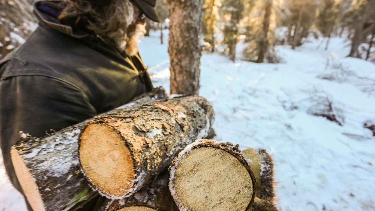 En plein hiver, un homme ramasse du bois.,copyright: A&E Television Networks, LLC