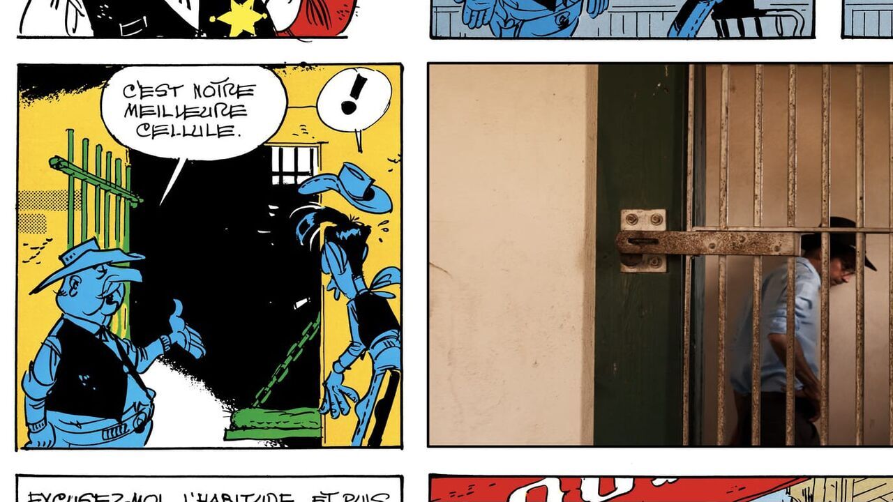 Extrait de la BD "Calamity Jane" et Jul dans une cellule, "Dans les bottes de Lucky Luke", documentaire de Xavier Lefebvre et Jul, épisode 1,copyright: © Grand Angle Productions / Luc / © Grand Angle Productions / Lucky Comics